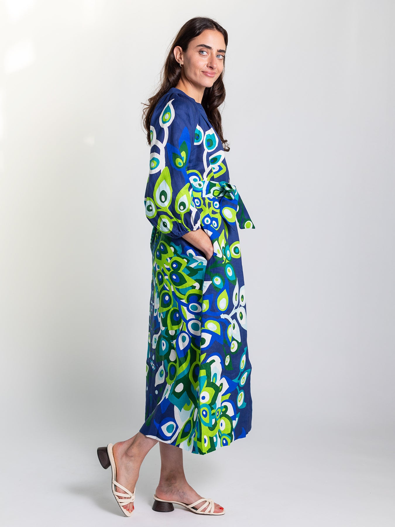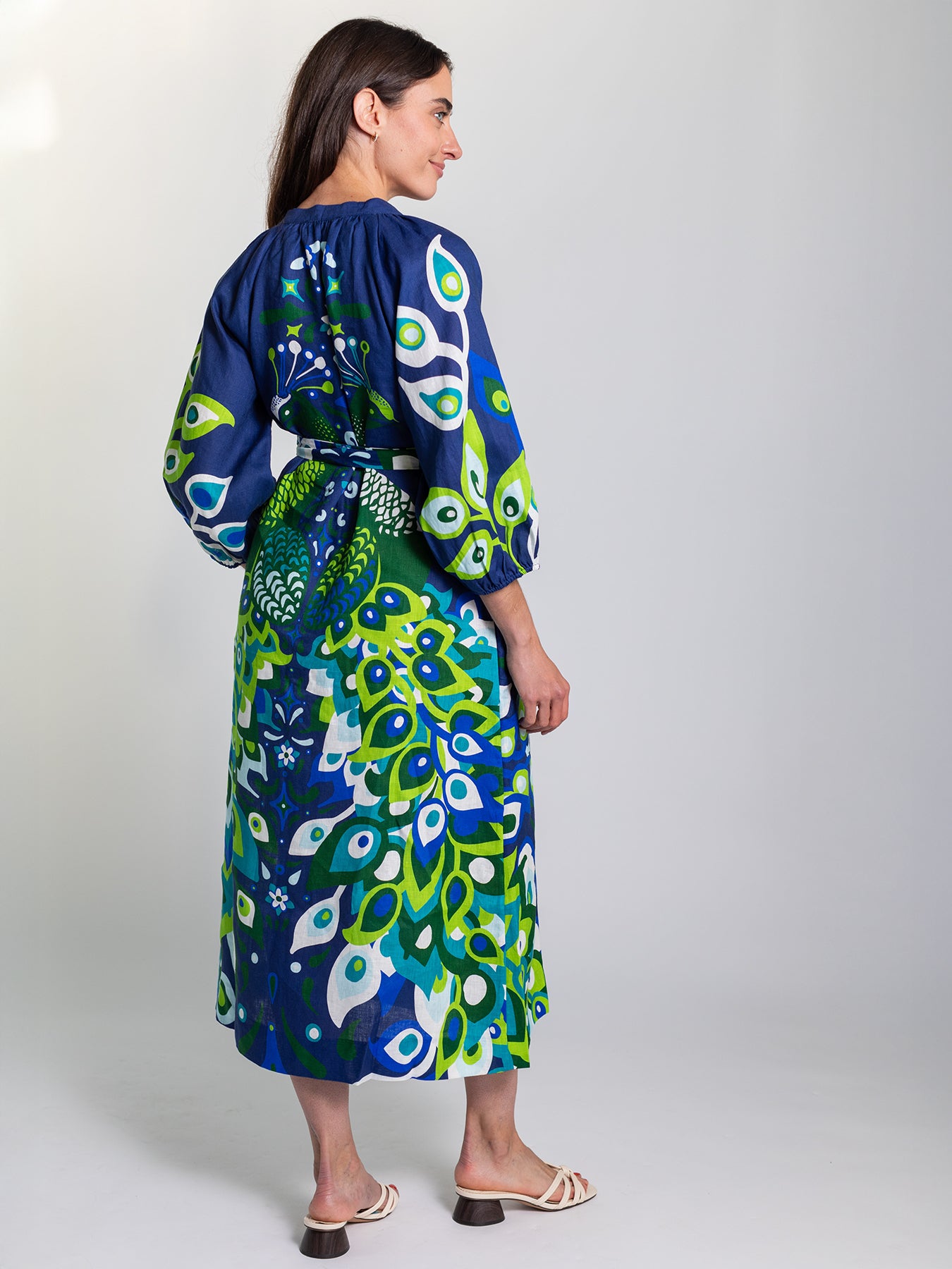 Meet the Henrietta, a linen dress with an elegant peacock motif across the back and feathers that sweep around the sides.