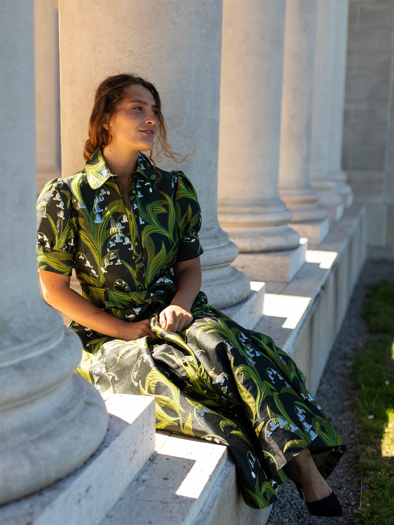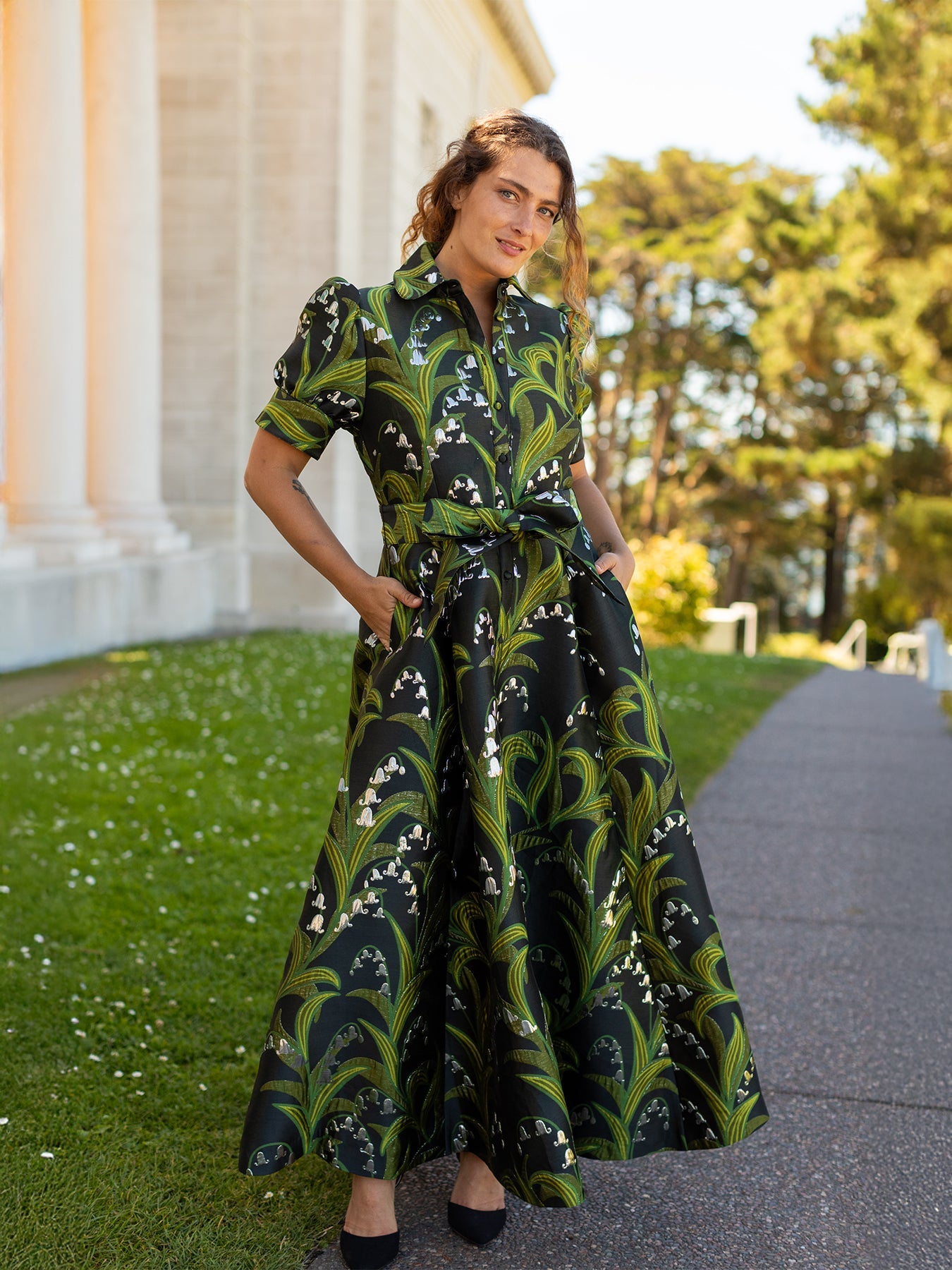 Step into a world of timeless elegance with the Evangeline full-length gown, a masterpiece crafted from our exclusive woven jacquard. The original textile design features Lily of the Valley— shimmering silver flowers on a black ground with two toned leaves.