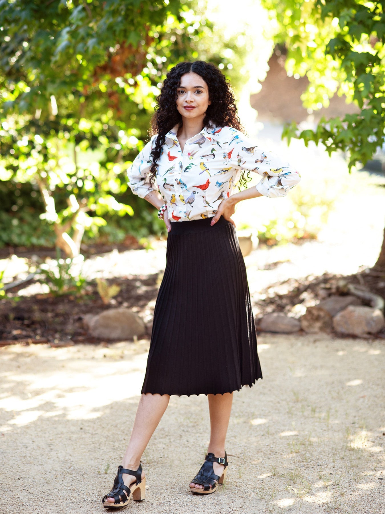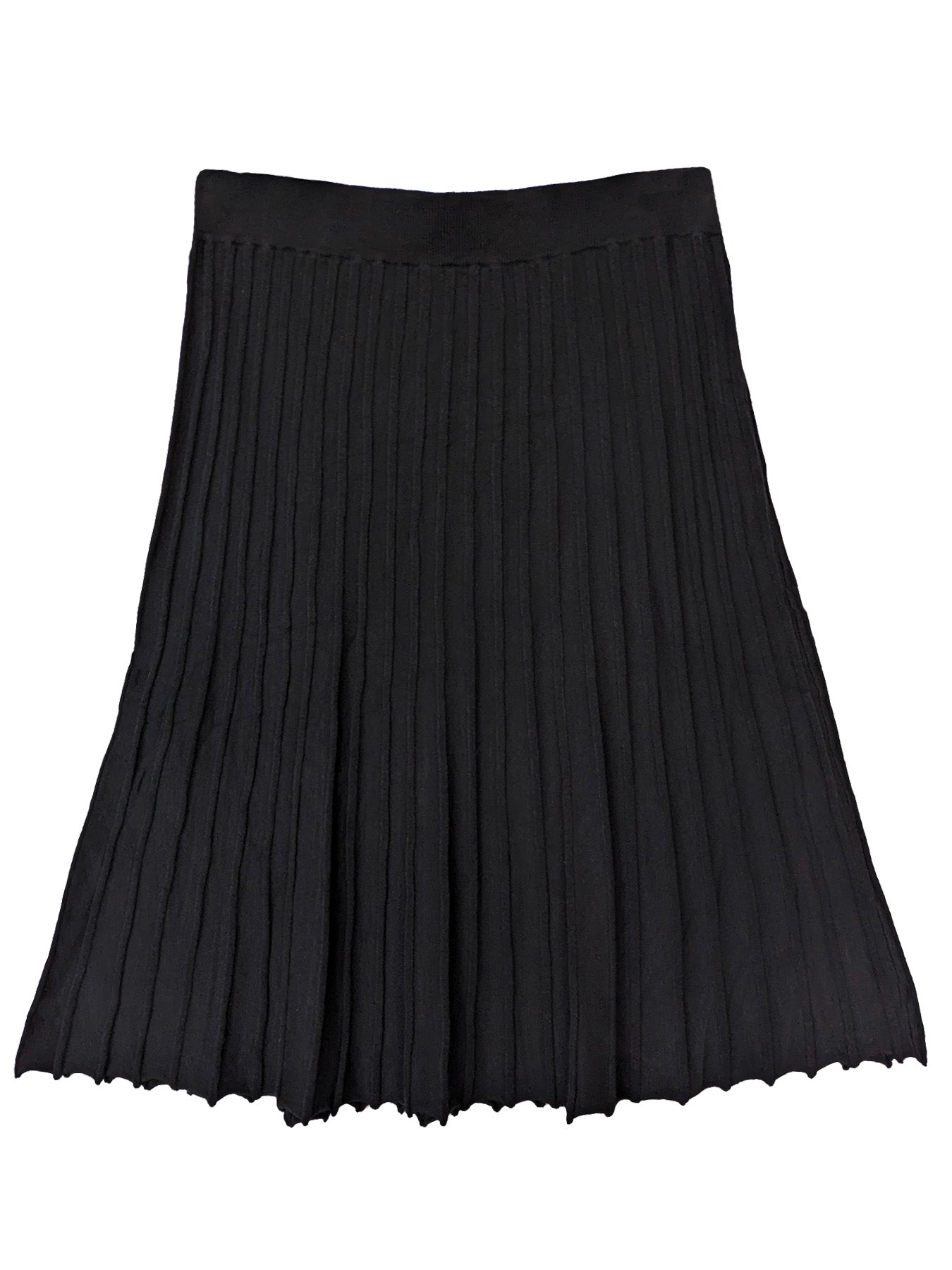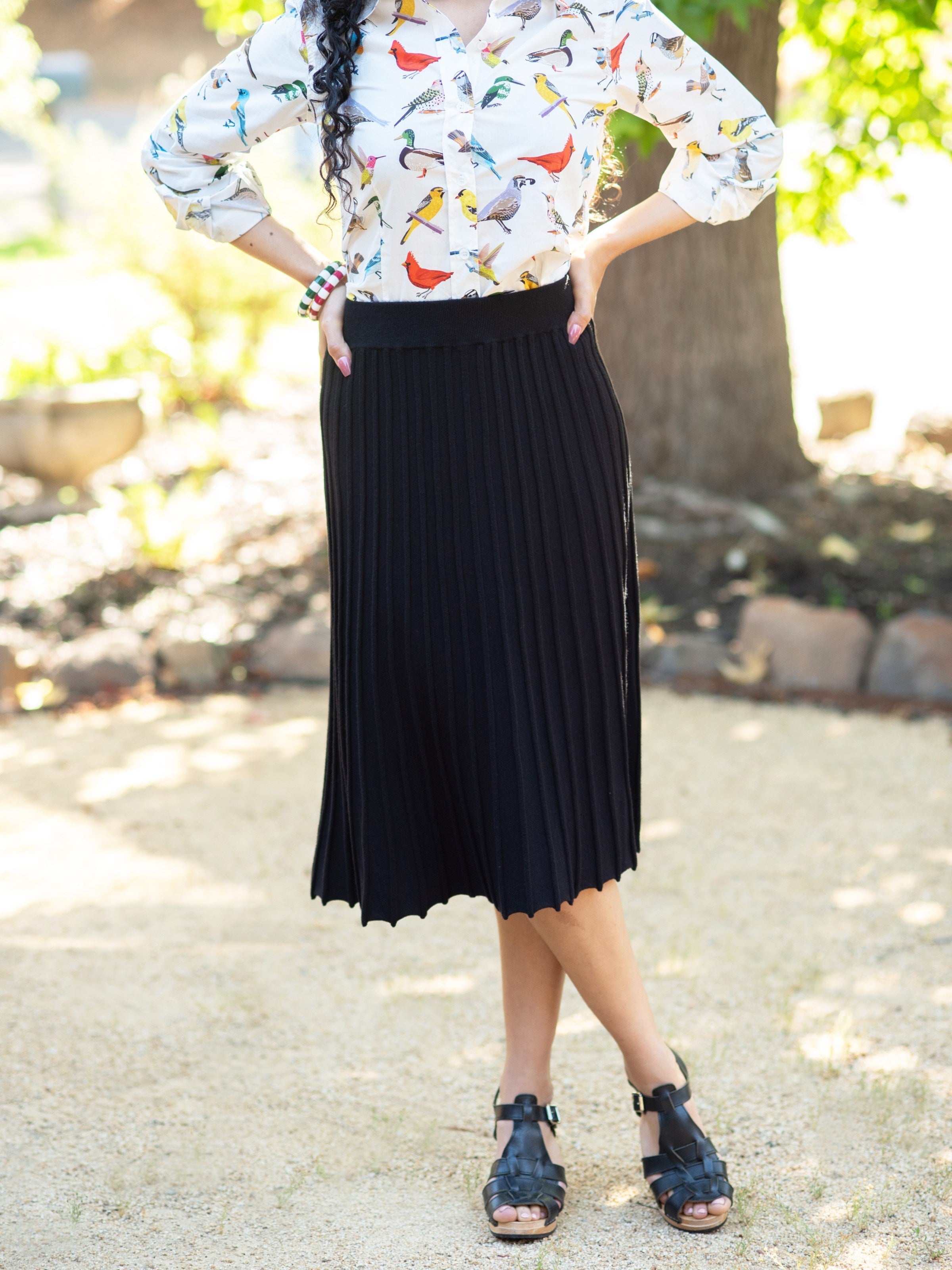 This little knit skirt is flattering and fun to wear. It hits just below the knee and is made from a stretchy knit fabric that will move with you all day long. The half inch pleats dress it up making it perfect for any occasion.